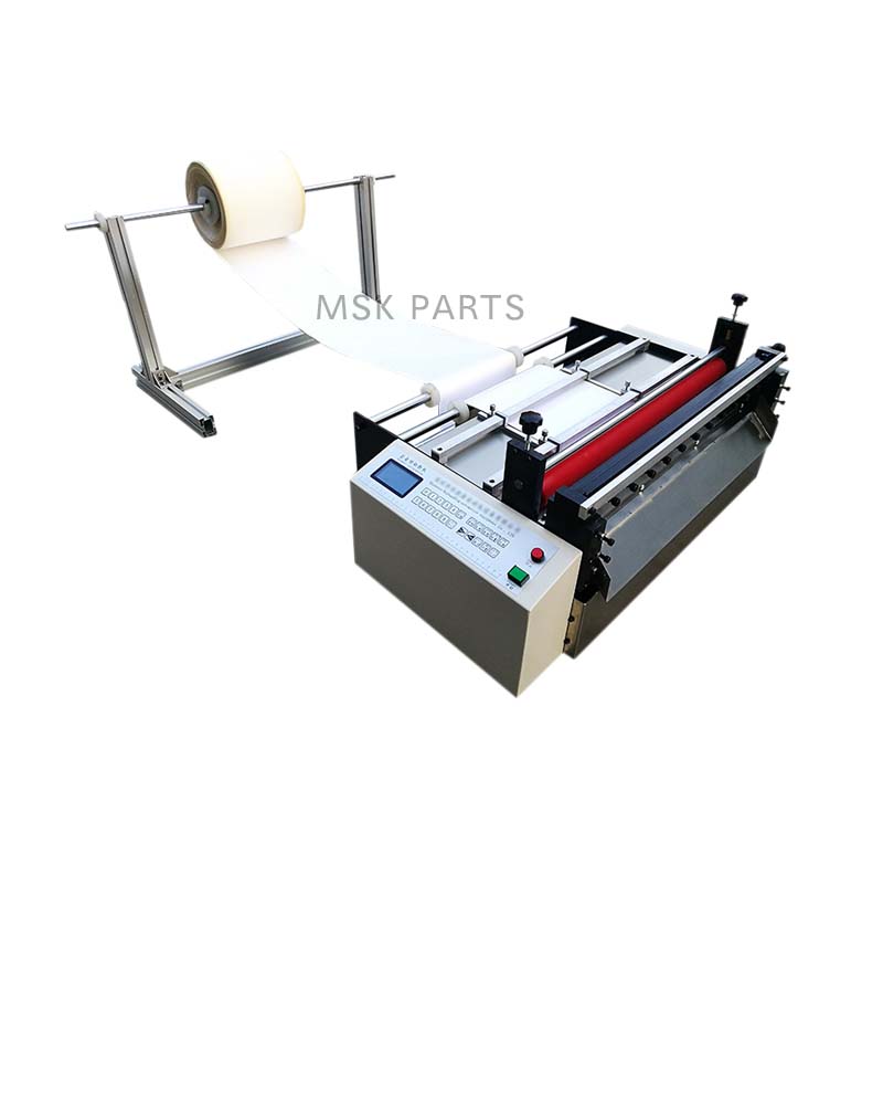 Machine with precise cutting length ability and wide range width of fabric the machine can work with, not only able to cut fabrics like filter mesh fabric or needle felt fabric but also machine is able to cut different materials in different industries such as wires, plastic, rop, paper, tube, tape, paper...ect.